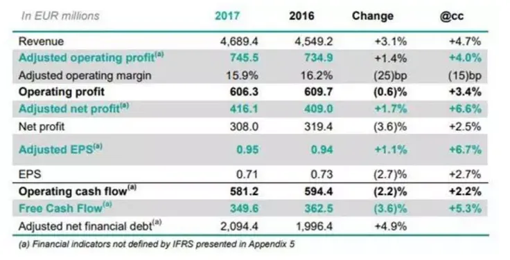 ► 2017年收入为46.89亿欧元,与去年同比增长3.1%,有机增长率达到+2.2%