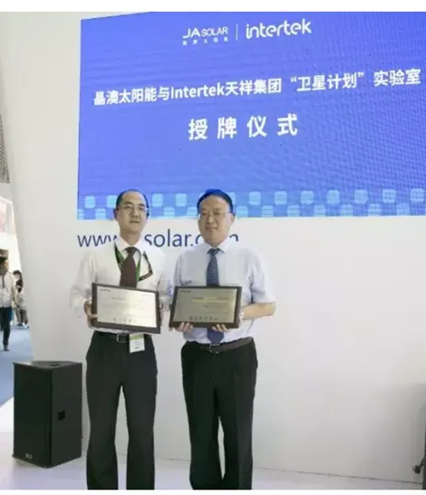 5月28日,SNEC第十二届( 2018)国际太阳能光伏展在上海开幕,全球领先的高性能光伏产品制造商晶澳太阳能控股有限公司(以下简称“晶澳太阳能”)获得Intertek天祥集团(以下简称“Intertek”)颁发的全球首家UL 61215及UL 61730标准的“卫星计划”实验室资质。晶澳太阳能早在2012年便获得Intertek“卫星计划”实验室资质,此次实验室扩大了美标认证项目中可用的实验室资源,今后,晶澳太阳能实验室的测试内容将包含北美市场对光伏组件的最新标准要求,为其光伏组件决胜北美及全球市场提供了更可靠的保障。授牌仪式在晶澳太阳能展台隆重举行,晶澳太阳能轮值总裁牛新伟博士、Intertek电气与网络保障部华东区销售总监李一峰先生等双方代表出席了仪式。