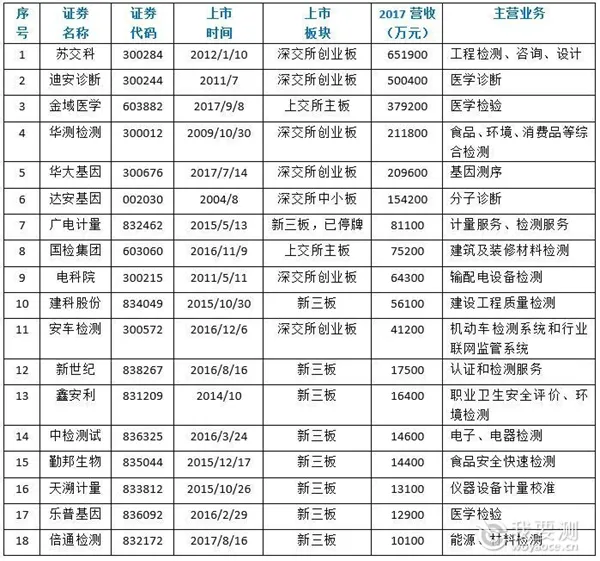 据不完全统计,截至2018年6月底,上市(包括新三板挂牌)的检测机构共有73家。相比于我国现有的36000余家的检验检测认证机构市场总体来说,上市的比例还很小。那么,国内目前上市的检测机构都有哪些特点?他们的规模如何?主营业务主要集中什么领域?我要测网小编对其进行汇总和盘点。
