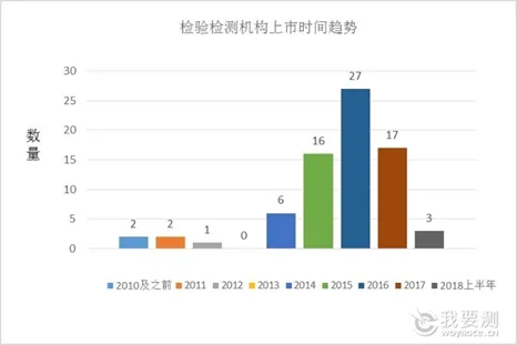 在2013年及之前,检测机构并未有大规模的上市,2014年以后,越来越多的检测机构通过谋求上市来获得更好的品牌曝光以及资本融入。至2016年检测机构上市风潮达到顶峰,共27家。2016年以后,逐渐回落。2018年上半年,仅有3家机构上市。