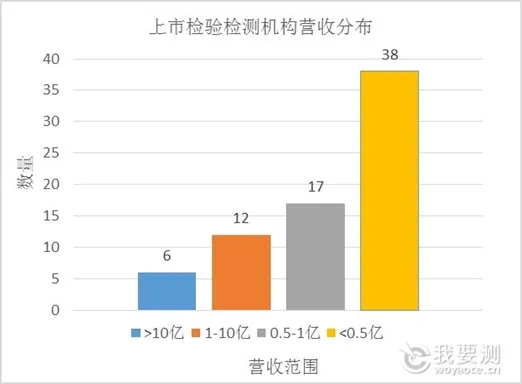 73家上市检测机构的平均产值3.75亿,中位值5488万。小编将营收规模大致分为:>10亿、1-10亿、0.5-1亿、<0.5亿。一半以上的机构年营收小于0.5亿,1亿以上的机构仅有18家。