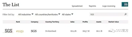 近日,《福布斯》网站发布2019年全球企业2000强榜单。凭借69亿瑞士法郎销售额、6.57亿瑞士法郎利润、62亿瑞士法郎资产和198亿瑞士法郎市值,SGS荣列榜单第1151位,占据全球第三方检测认证机构(TIC)首位的宝座。SGS曾多次入选福布斯全球最具创新力企业、全球2000强跨国企业最佳表现等多个榜单。此次入选,再次彰显了SGS在全球商业世界中的卓越影响力。