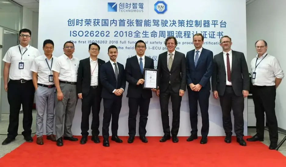源自德国目前最大的TÜV机构——TÜV南德意志集团(以下简称“TÜV南德”)为上海创时汽车科技有限公司(以下简称“创时智驾”)的智能驾驶决策控制器平台产品颁发ISO 26262:2018全生命周期功能安全认证证书,来自 TÜV南德北亚区质量与技术部专家Freddy Paz,TÜV南德大中华区交通服务部高级经理赵翀旻出席授证仪式。该证书是自2018年12月新版ISO 26262标准发布以来,由TÜV南德签发的大中华区首张功能安全流程认证证书。这张证书的授予标志着创时智驾的产品已根据ISO 26262:2018的要求建立起完善的、符合汽车功能安全最高等级“ASIL D”级别的产品开发流程体系,同时也进一步彰显了TÜV南德作为全球领先的功能安全权威技术机构,致力为国内智能驾驶决策控制器制造商在提升核心技术竞争力环节保驾护航。