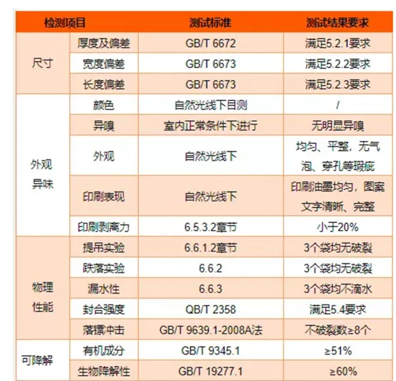 我们以超市中提供的生物降解塑料购物袋为例,按照GB/T 38082-2019进行测试的话,需要完成的具体项目指标如下表: