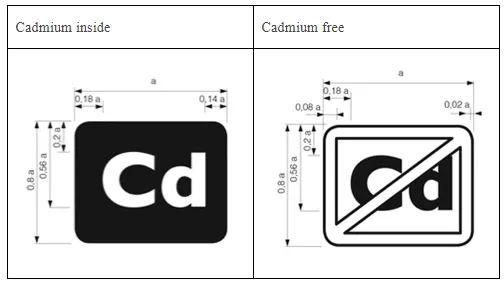 带有屏幕面板的电子显示器中,均质材料中按重量计算的镉(Cd)浓度超过2011/65/EU指令中关于限制在电气和电子设备中使用某些危险物质的规定的0.01%,应贴上“Cadmium inside”标志。标志应清晰可见,耐用,易读和不可磨灭。标志应采用下列图形形式: