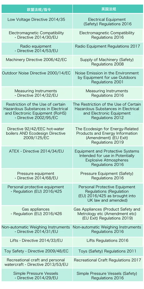 可以说,UKCA的产品的要求与CE基本一致,CE法规/指令与英国法规对照如下表: